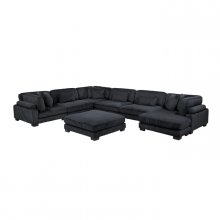 Configurable to your available space, the Traverse Collection allows for the addition and detachment of pieces for a customized seating experience. The 7-piece sectional configuration consists of two corner units paired with three armless chairs, a chaise and an ottoman. The black corduroy fabric upholstery creates a plush expanse for a soft touch experience.