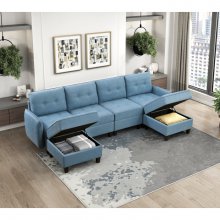Maximize both comfort and flexibility in your living space with this blue fabric modular storage accent chair. Designed to stand alone or integrate seamlessly into a modular sectional group, this chair offers versatile seating and convenient hidden storage. Featuring a sturdy solid wood and plywood frame, foam padding over pocket coils, and a textured fabric upholstery, this chair provides both durability and a luxurious seating experience. The button-tufted details add a touch of classic elegance, while the hidden storage beneath the seat offers practical decluttering. The reversible back and attached seat cushions ensure long-lasting comfort, and the removable back cushion cover simplifies cleaning. With exposed feet in a black faux wood finish and easy assembly, this chair is perfect for customizing your living room, bedroom, or entryway.