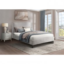 Freshen your bedroom without sacrificing comfort or style with the Dunkirk Collection. Supported atop dark nickel-toned metal legs, this understated Queen Bed also features a contemporary winged headboard with an attractive nail-head trim that elevates the design beyond the ordinary. Upholstered entirely in soft textured fabric in a neutral beige-grey hue, this bed's unassuming style invites all sorts of décor choices, giving you carte blanche for your bedroom aspirations. Rest easy knowing that the platform design means your mattress sits securely at just the right height without the need for an additional foundation or box-spring. The Dunkirk doesn’t just transform your space, it revamps how you experience comfort by bringing both style and serenity to your room.