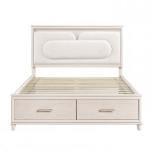 Revitalize your bedroom with this sleek and highly functional platform bed with footboard storage, delivering a modern aesthetic with smart, integrated convenience. The striking headboard is elegantly upholstered in soft chenille fabric and features built-in next-generatin COB LED lighting to create a sophisticated, natural glow. Finished in a contemporary white with subtle texture from the embossed panel drawer fronts, this bed is supported by high-quality construction using a blend of wood and engineered wood. Maximize your space with the footboard’s two spacious dovetail storage drawers, which glide smoothly on ball-bearing glides, and enjoy the streamlined convenience of a design that is ready for your mattress since a foundation or box spring is not required.