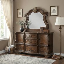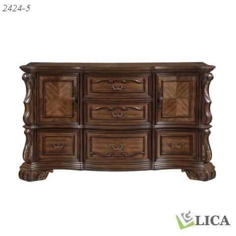 Infuse your bedroom with the regal charm of this traditional dark brown dresser, a masterpiece of classic design and organization. Expertly crafted with rich pecan and ash burl veneers, the stately silhouette is elevated by intricate carvings and opulent gold accent detailing. This high-capacity storage solution features five spacious dovetail drawers on smooth ball-bearing glides, complemented by two unique side cabinets with adjustable shelving. Adorned with vintage-inspired drop handles, this sturdy wooden piece arrives fully assembled for immediate luxury.