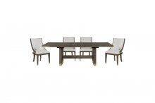 Curating a space that reflects your love for modern lines and desire for a sophisticated aesthetic becomes reality with the addition of the Griffin Collection. A brown finish highlights the sunburst oak veneer pattern, its rich hue complemented by the gold finish metal banding that graces the table’s apron and trestle base, chair legs, and server’s floating top and base. Expanding the table’s seating capacity is the self-storing table leaf. Wood framed side chairs feature beige linen-like fabric upholstery covering the seats and backs, providing perfect contrasting complement to the brown finish of the collection. Push-latch closures allow for hardware-less door fronts, and floating top lends to the modern profile of the server, while behind door shelving provides ample space for storage of your tabletop accessories.