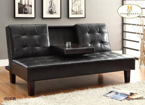 | The Reel Collection. Beyond the click mechanism function of this futon/sofa is the convenient fold down armrest with beverage holder. Dark Brown Leatherette |
