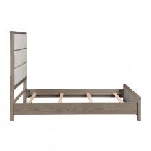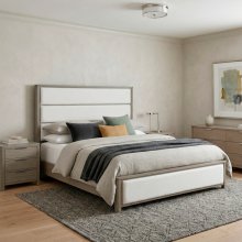 Introduce luxury and serene style into your bedroom with this sophisticated Caifornia King panel bed, a beautiful blend of wood finish and plush fabric comfort. The frame is constructed from a durable mix of wood, engineered wood, and high-quality oak veneer, featuring a contemporary light gray finish that provides a fresh, modern foundation. The headboard and footboard are elegantly enhanced with soft, textured chenille fabric upholstery in a neutral beige tone, adding warmth and a refined look to the frame. This complete bed set includes the headboard, footboard, and rails, establishing a tranquil centerpiece that is ready for your required foundation or box spring and mattress.