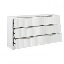 Enhance your bedroom storage with this stunning pearl white dresser, a masterpiece of modern design and functional elegance. Featuring six spacious drawers with sophisticated textured panels and sleek silver-tone edge pulls, this piece offers a high-end designer aesthetic that brightens any space. Built with premium wood construction and smooth ball-bearing glides, it ensures effortless organization and long-lasting durability. Arriving fully assembled, this chic double dresser provides an instant style upgrade for a luxurious, clutter-free sanctuary.