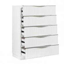 Elevate your bedroom organization with this stunning pearl white chest, a perfect fusion of high-end glam and contemporary functionality. Featuring five spacious drawers adorned with sophisticated textured panels and sleek silver-tone edge pulls, this vertical dresser offers a designer aesthetic that maximizes floor space. Built with premium wood construction and smooth-operating glides, it ensures effortless storage for your wardrobe essentials. Arriving fully assembled, this chic tall chest provides an instant luxury upgrade for a bright, organized, and stylish sanctuary.