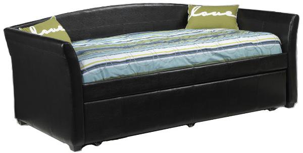 | This daybed is not only a stylish relaxation platform it also functions as a comfortable bed. The twin size daybed features additional sleeping space in the form of a pull-out trundle. Dark Brown Leatherette |