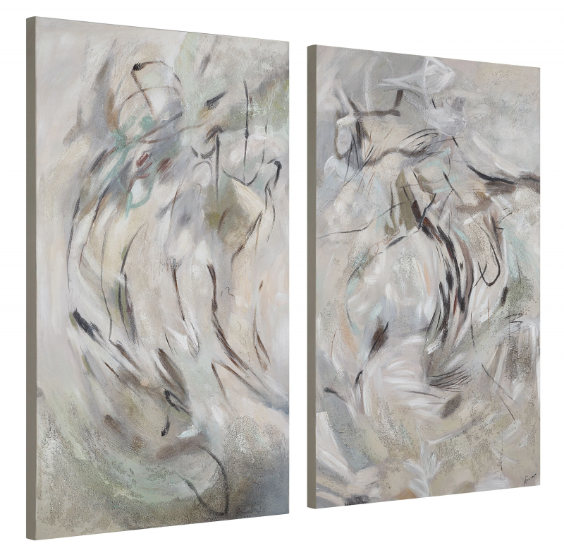 Hand painted on high-quality stretched canvas, this set of two wall art canvases is ideal for interiors that lean transitional or modern. Generous dimensions and 2-way hanging allows for a multitude of display options letting you choose the arrangement that best suits your design vision for the space you're perfecting. Product Details: