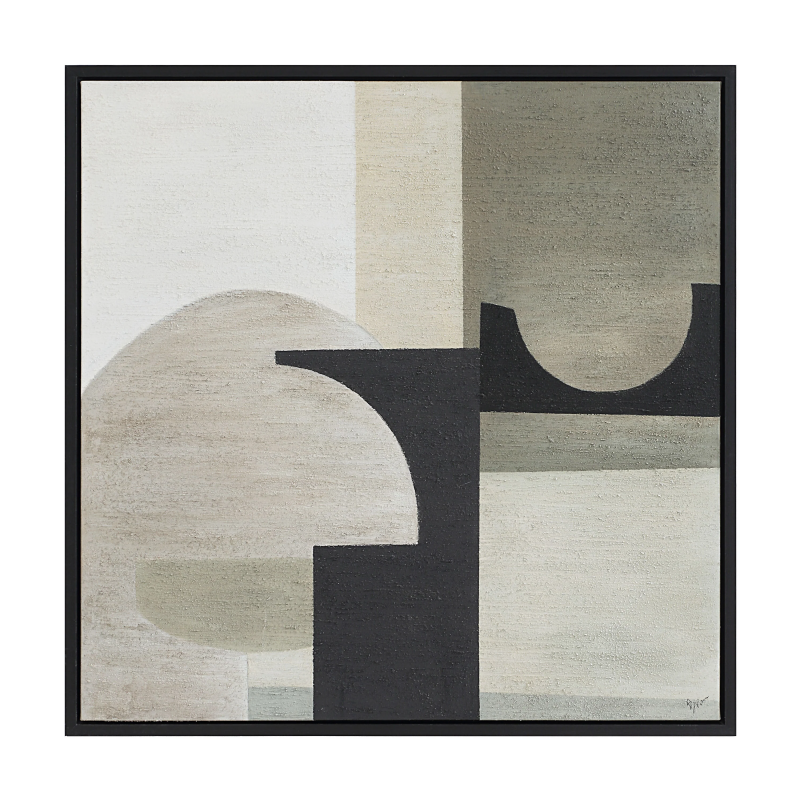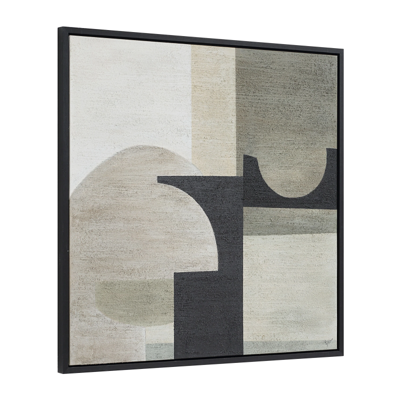 Characterized by a neutral palette and modern minimalism, the Gladiolus abstract art painting is poised to deliver a stylish impact to any space. Featuring a bold composition of shapes that are simultaneously geometric and organic, its shades of black and cream create a striking effect for all to admire. Hand painted using a sand gel textured technique, this continuous edge canvas has an art gallery look that’s emphasized by its black frame. Ready to hang in any modern home or office, all that’s left for you to do is choose the perfect wall to highlight its endless appeal. Product Details: