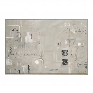 This abstract art painting allows every passerby to create their own narrative from its print details and brush strokes. In the home office or workplace, this canvas art sparks creativity without overpowering the space. The muted palette extends out to the light walnut frame, making placement within an interior an effortless process. Product Details: