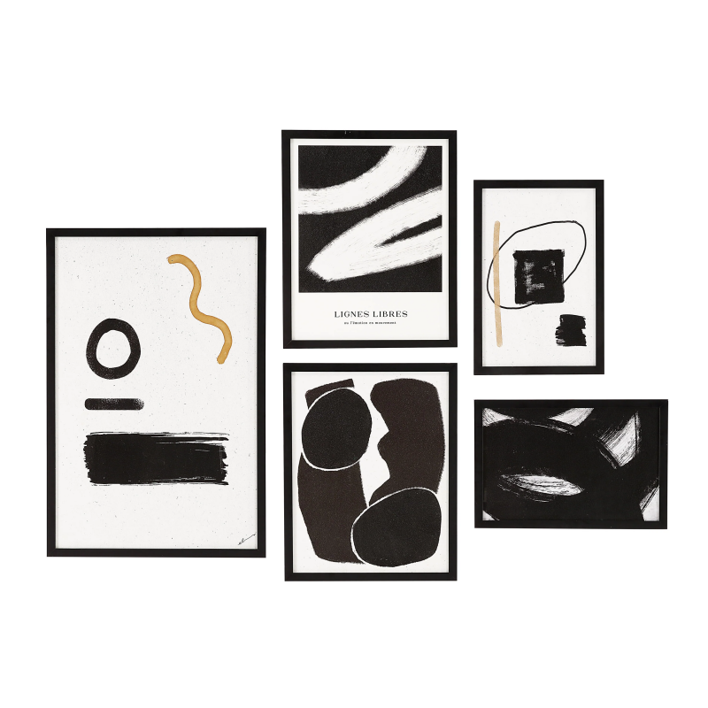 This set of five wall art prints envelops the home interior with the artistry of modern graphic design. In the mid-century modern or minimalist contemporary home, these framed canvases serve as the final piece to make a space feel complete without overpowering the vibe of the interior. Well-suited for a living space or home office, these works of art can be placed in a variety of arrangements with their diverse sizes presenting many options. Product Details: