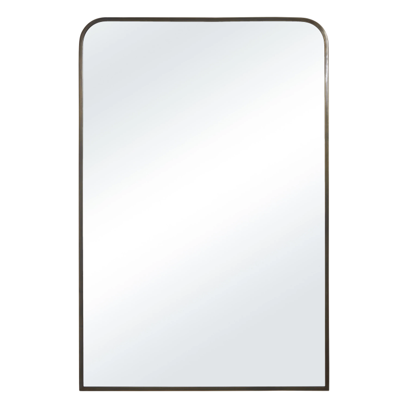 Possessing a modern and timeless quality at once, this mirror complements decor elements in its vicinity while making a stylish statement of its own. At 24 by 36 inches, it holds idyllic dimensions to rest atop a vanity or dresser. With a gold powder-coated iron frame, it is an optimal fit within a mid-century modern interior, with the ability to go classic when styled for such. Product Details: