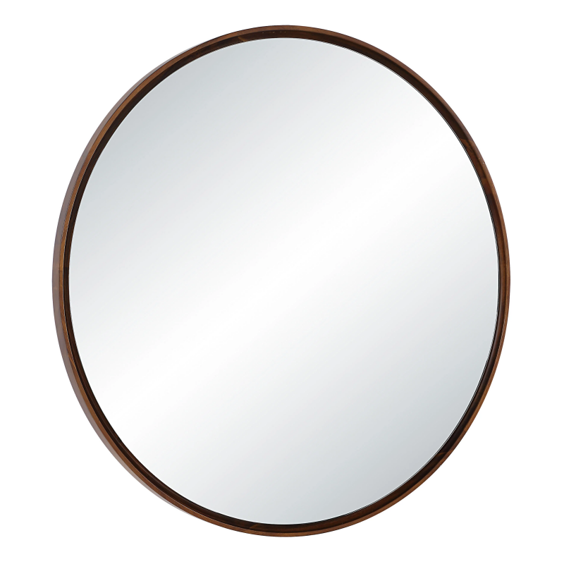 Discover this clean-lined round mirror to give your design project style without sacrificing function. Crafted with high-quality distortion-free glass and a walnut-finished frame, this round mirror would be perfect hanging on its own or mixed into a gallery wall for an eye-catching impact. Product Details: