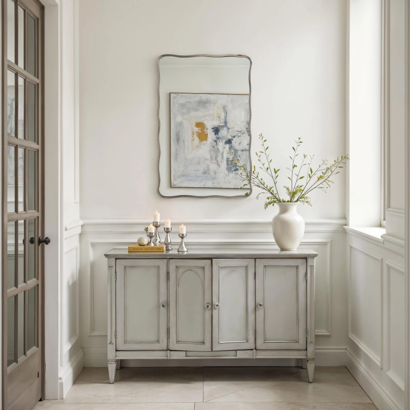 Elevate any room with this irregularly shaped rectangular wall mirror. Measuring 24"x 36", and featuring 2-way hanging, it's ideal for displaying horizontally or vertically above a fireplace, entry table or dining room credenza. An antique nickel frame provides style and durability while crystal-clear mirror glass delivers a distortion-free reflection unique to high-quality pieces. Product Details: