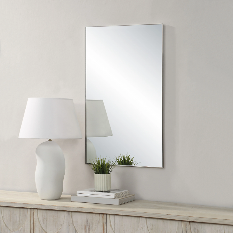 Make a statement with this clean lined, simply styled modern wall art mirror. Its slim, polished nickel-plated frame makes it perfectly suited for hanging in contemporary spaces while its high-quality craftsmanship ensures a distortion-free reflection from every angle. Product Details: