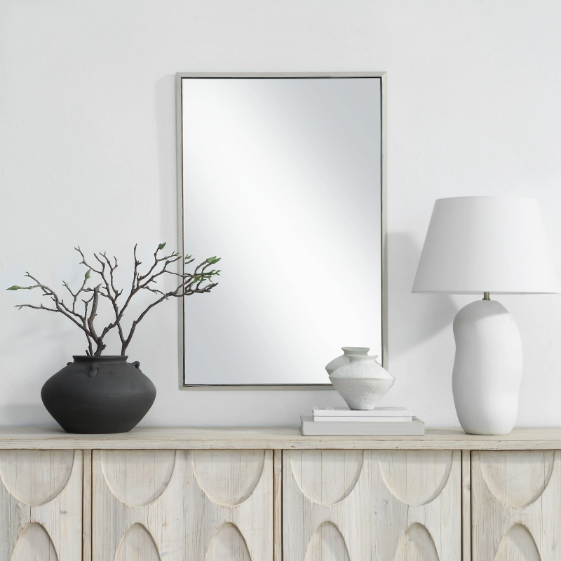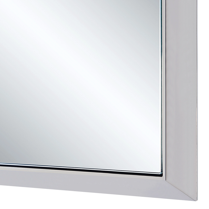 The perfect choice for settings where clean lines are in order, this rectangular wall art mirror brings its blend of form and function to make a stylish impact in any interior. Crafted with a sleek nickel-plated frame and distortion-free mirror glass, its simple design is well-suited for transitional or contemporary spaces, alike. Product Details: