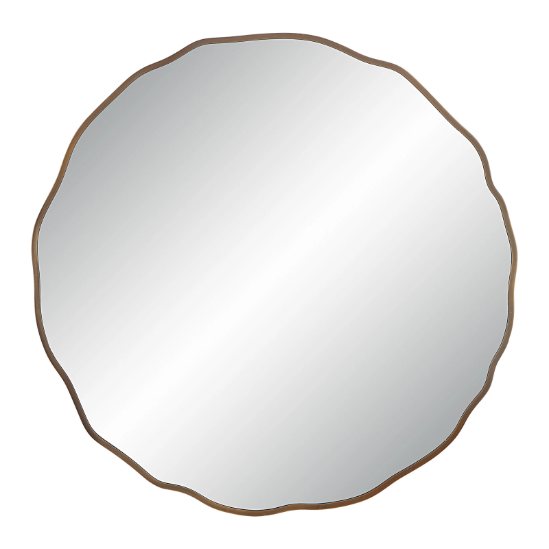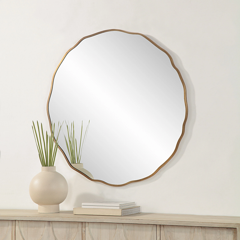 The Bern 40" Tall Round Irregular Mirror in Antique Brushed Brass is a stunning addition to any room. Its beautiful design incorporates an irregular shape and antique brushed brass finish for a vintage, yet modern aesthetic. The high-quality and durable cast iron frame ensure that it is built to last and can be passed down through generations. The abstract-shaped mirror adds intrigue and modern flair to any room, making it the perfect centerpiece. It also comes equipped with a D-Ring hanging system for easy installation and is also equipped for four-way hanging, providing versatile display options. Whether placed in a bedroom, dressing room, or foyer, the Bern 40" Tall Round Irregular Mirror is sure to impress. Product Details: