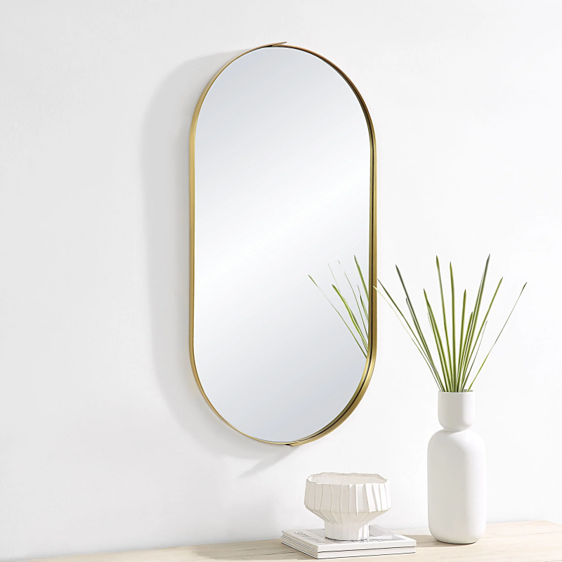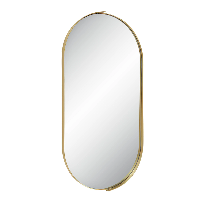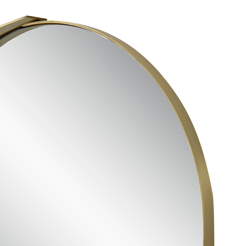 This mirror’s structure fills the home interior with a glowing light that reaches every corner. Set vertically, it can be used to take in one’s full reflection in the bedroom or entryway. Set horizontally, it can expand the appearance of a dining table or living room space. With satin brass details, this framed mirror is well-suited for both classic and contemporary aesthetics. Product Details: