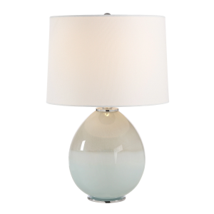 Your search for the perfect table lamp to feature in your transitional design project ends here. This one expertly combines pale blue glass, chrome details and a crisp white linen shade to create a lamp with classic good looks. Anywhere you place it, beautiful light and style are guaranteed. Product Details: