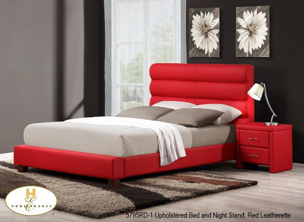 | The Aven Collection. With a boldly styled rolled headboard in Black or Red Leatherette, this upholstered bed and coordinating leatherette night stand will provide you the platform to design a thoroughly modern bedroom. |