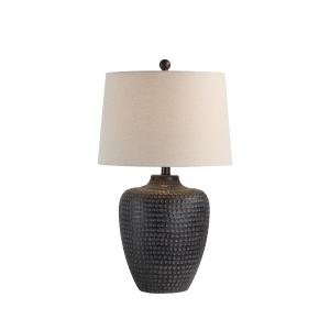 Embracing the earthenware trend is easy when you've got the stylish Agueda table lamp on display in a dining room, living room or bedroom. Sitting atop its brass-plated fitting is a lovely oatmeal linen drum shade that diffuses ambient light while its generously sized body features a hammered texture with a dark brown finish that brings plenty of interest to any home. Product Details: