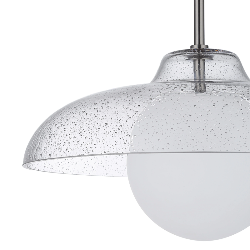 Once you lay eyes on the Dayana ceiling light fixture, you’ll know you’ve found the perfect pendant worthy your design project. It features a unique combination of two types of glass and plated satin nickel hardware that work together to deliver a beautifully balanced, timeless look in any interior. Its seeded glass shade and etched glass globe both transform light into a softly diffused ambient glow for lighting that’s just right and never too bright. Perfect for hanging solo over a kitchen table or in an entryway, or in multiples over an island, this ceiling pendant is sure to leave a lasting impression anywhere it hangs. Product Details: