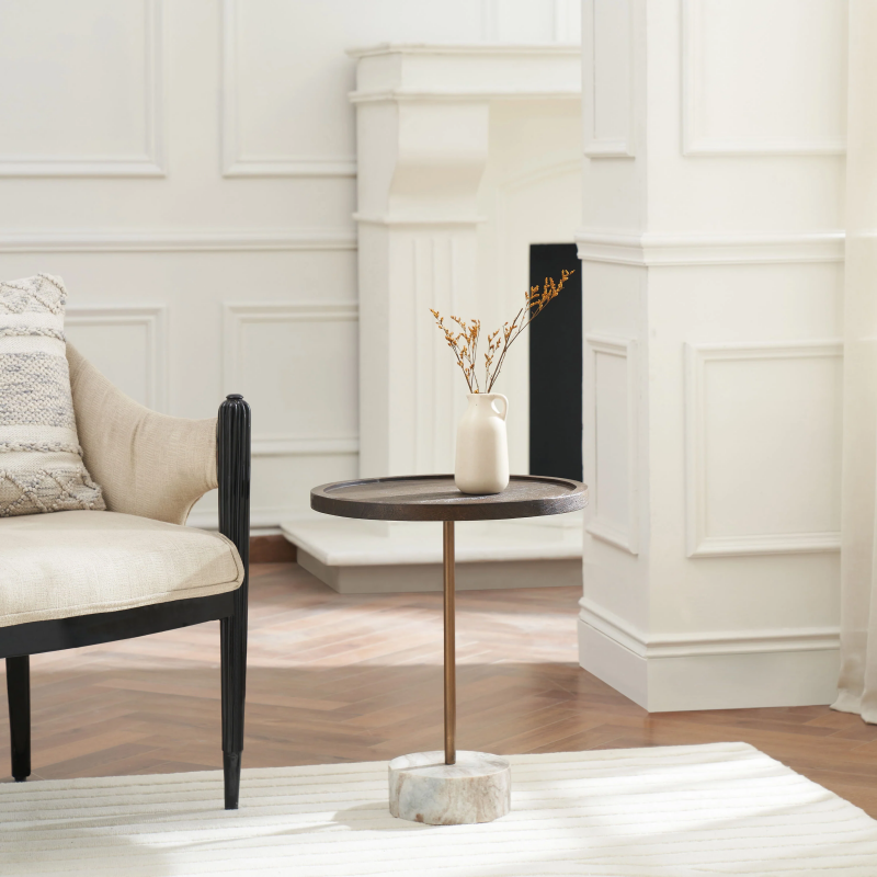 Measuring 18 inches wide, this accent table is an ideal size for placement next to a couch, chaise longue or bed. It features a natural marble and antique brass finished iron base for an airy feel and a mango wood tabletop with a walnut finish for a dark wood effect that’s totally on trend. Sleek and simple in its design, this end table would be a great complement to any design project. Product Details: