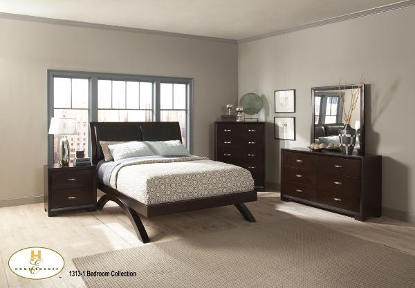 | The Astrid Collection. From the espresso finish to the accenting bi-cast vinyl insert on the headboard or chrome hardware, this collection exudes the attitude that defines the style. Bold solid hardwood arched legs support the platform bed, while recessed beveled edging cleanly frames each case piece. Metal Glide and Dovetail Drawers. |