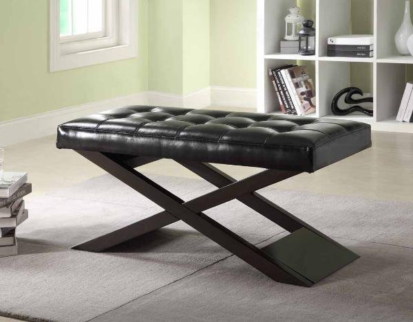 | The Natalia Collection. Add a bold statement to your home with this collection. Espresso finished X-framing supports the button tufted black leatherette seat of this decorative bench. |