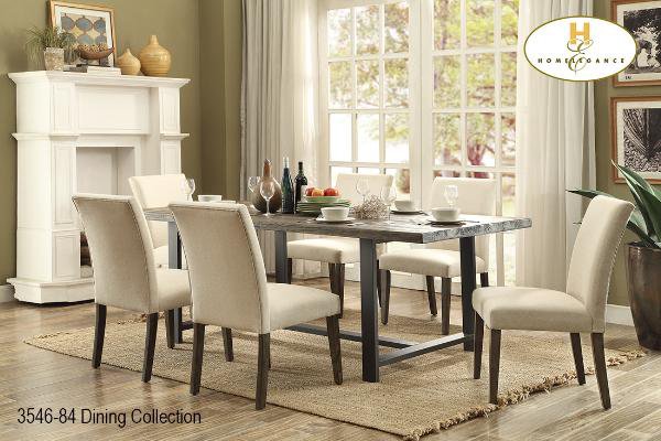 | The Anacortes Collection. Rusticated polyresin embossed-grain wood top sits atop metal framing in the Anacortes Collection. Industrial minimalism is achieved by the base frame's unfettered design and emboldened by the substantial size of the burnished natural-finish wood tabletop. Light, neutral tone fabric chairs feature burnished wood legs that perfectly compliment the tabletop. |