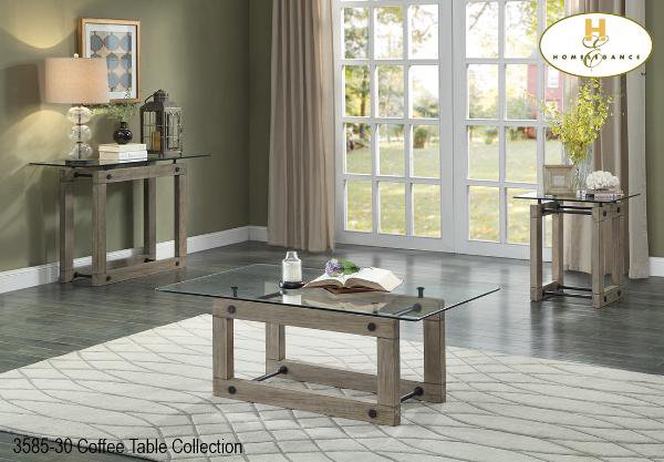 The Mesilla Collection. The dual, continuous frames that provide support to the glass tops of the Mesilla Collection lend harmonious balance and modern feel to the look of this occasional offering. The solid wood bases are featured in natural wood tone, while the cross metal support bars are covered in black powder coating. |