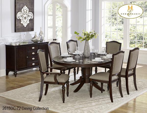 | The Marston Collection. The 72 inch oval/round table is flanked by chairs that feature turned front legs with nail head accent or with no nail head accent, along with a neutral tone fabric that covers the seats and backs. |