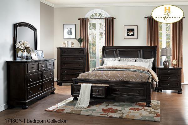 The Begonia Collection. Casual transitional styling lends versatility to the placement of the Begonia Collection in a number of bedroom settings. The gray finish lends distinctly to the execution of different looks from traditional to country casual, with knob hardware punctuating the look of each framed drawer front. Hidden drawers in the nightstand and dresser provide discrete storage for your valuables, while the storage drawers of the footboard provide a more visible means of additional storage capability. Bun feet support the case goods and a sleigh headboard finish off the transitional design of the collection.