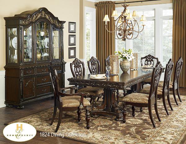 | The Catalonia Collection. Old-World European styling is captured in the dramatically elegant Catalonia Collection. Traditional design elements reign at every turn – egg and dart molding, acanthus leaf carving, bead molding, gold tipping and extravagant carvings – creating a sophisticated look for your dining. A traditional cherry finish is utilized to highlight the cherry veneer of the set and decorative inlay patterns found on the tops. |