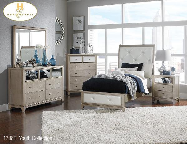 | The Odelia Collection. The striking silver finish of this collection serves to highlight the decorative accents that reign the design - crocodile embossed drawer fronts with polished nickel hardware, mirrored top drawer fronts with their faceted knob hardware and crystal-embellished button tufted pear bi-cast vinyl inserts on the headboard and footboard. |