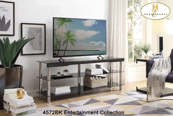 Entertainment Collection featuring a 63in TV Stand with a Black tempered glass top and stainless Steel Legs.