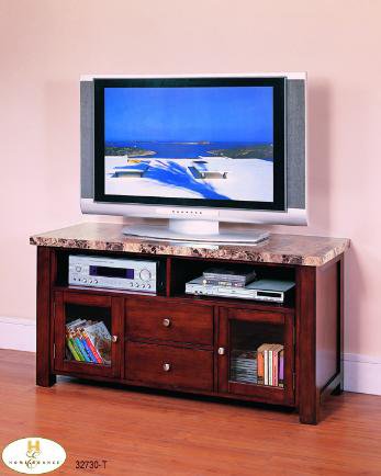 | The Achillea Collection. The decorative faux marble top of this TV Stand has a similar depth of tone and pattern only found in natural beauty of marble. Hardwood solids and veneers in burnished cherry finish. |