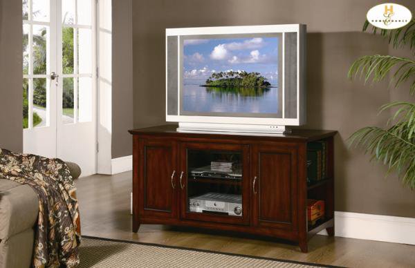| The Ian Lynman Collection. This collection is offered in a warm cherry finish on select hardwoods and birch veneer and transitional styling. Nickel hardware, glass-fronted and side media storage further compliment the look of the unit. |