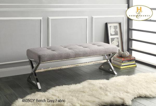 | The Rory Collection. In looking for an accent piece for your home, your desire style and functionality – the Rory Collection delivers on both counts. Offered in black bonded leather and gray linen fabric this decorative bench features button tufting and a continuous X-frame design. The padded seat, along with a clean design, provides the perfect spot for a moments rest. |