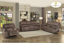 Motion Upholstery Collection offered in Power or manual recline. Covered In Dark Brown or Grey water/oil/stain resistant fabric.