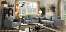 The Breeze Collection. The sofa-chaise combination features high density cushions with a memory foam topper for the utmost quality and resilience. Slightly angled loose back cushions optimize comfort, perfect for hours of lounging and socializing. Upholstered in neutral grey/azure blue/light seafoam blue with clean lines and slender legs in a bright chrome finish.