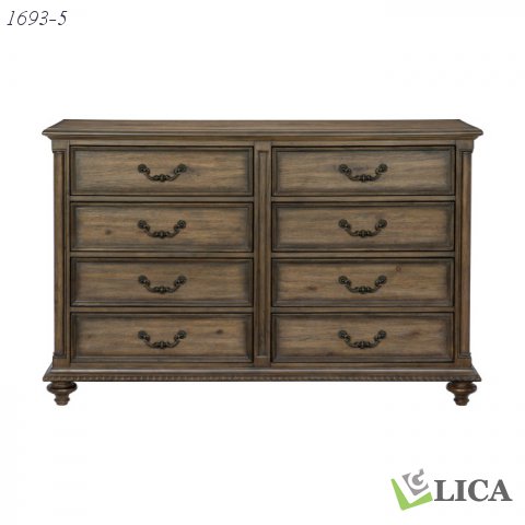 The balance of rusticated accenting and elegant form is exquisitely achieved in the design of the Rachelle Collection. The traditionally styled dresser features classic appointments such as turned feet brown-finished metal drop hardware, egg and dart molding and rounded pilasters. The knotty pecan wood veneer features a weathered pecan finish further lending to the classic look of the collection.