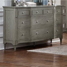 Refined elegance is exemplified in the design of the Albright Collection. Classic elements of understated traditional design combined with a barnwood gray finish over oak veneer and high polish knob hardware blend effortlessly to create a sophisticated modern traditional look for your bedroom. Elongated, tapered turned legs support the dresser.