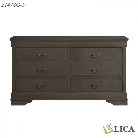 Traditional in design and modest in scale, the elegant Mayville Collection takes its design inspiration from the classic Louis Philippe styling. The Okume veneer of the dresser is paired with a stained gray finish and is accentuated by antique brass tone drop handles.