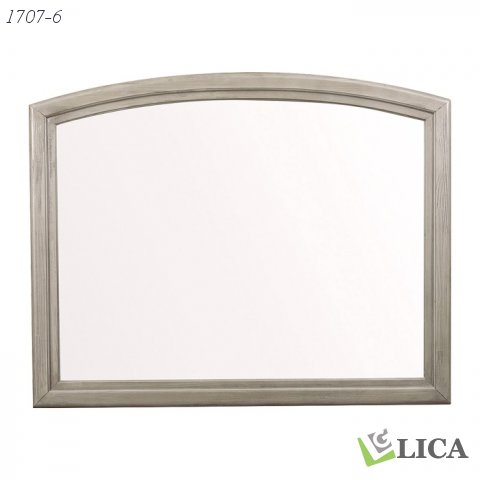 Transitional styling is paired with classic appointments to create the Lavonia Collection. A gray wire-brushed finish over ash veneer furthers the classic look of the dramatically curved mirror frame.