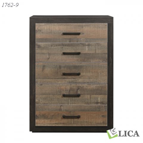 The Miter Collection combines the clean lines of contemporary styling with the look of natural wood grain in this stylish chest. The dresser’s embossed faux-wood veneer is utilized in both mahogany and ebony to achieve a 2-tone contrasted finish. Antique brass tone hardware provides additional contrast to the printed wood grain.