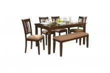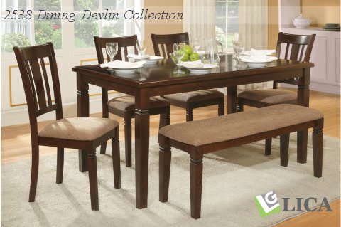 The Devlin Collection offers the classic look of transitional styling with a nod to the Arts and Craft movement all in a well appointed six-piece group. Neutral tone fabric covers the seats of the chairs and bench in the espresso finished collection. Notch accent completes the look of the collection.