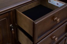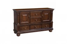 Elegantly designed for the traditional dining room is the Lordsburg Collection. Supported by the double pedestal base is the tabletop where the magnificent parquet veneer is highlighted by the brown cherry finish that covers the collection. Heavily carved molding provides distinct accent to the tabletop while brown faux leather covers the seats and backs of the coordinating wood-framed chairs. The accompanying hutch and buffet provide ample storage space for your tabletop accessories.