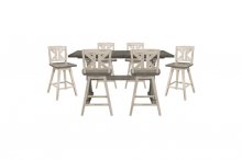 Creating a subtle rustic look is the design of the Amsonia Collection. A gray finish graces the solid rubberwood dining group highlighting the veneer. Providing visual interest beyond the classic styling, are the alternate finishes of the accompanying chairs, offered in black sand-though and white sand-through. The chairs also feature a swivel mechanism with three distinct seat backs – X-back, divided X-back and vertical slat back, lending to ease of motion while seated.