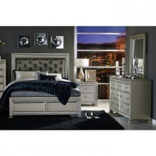 Modern glamour is exemplified in the design of the Bevelle Collection. Acrylic crystals frame the California King bed, reflecting the light to create eye-catching drama. The silver finish serves as the perfect complement to the medallion accents. Providing contrast to finish is the dark gray faux leather, button-tufted headboard panel.